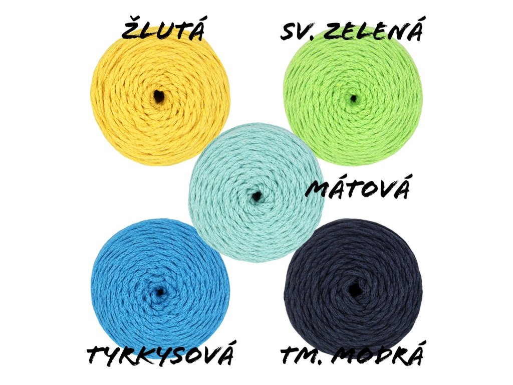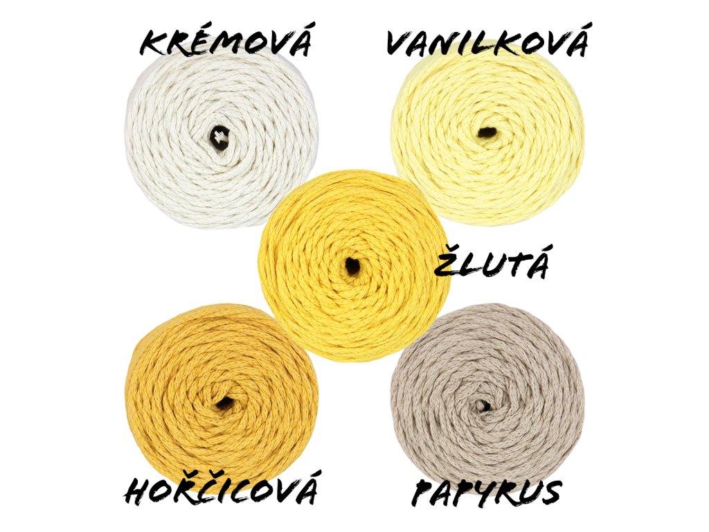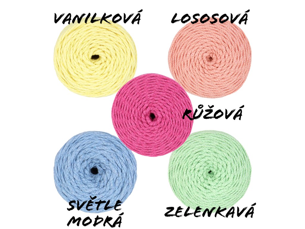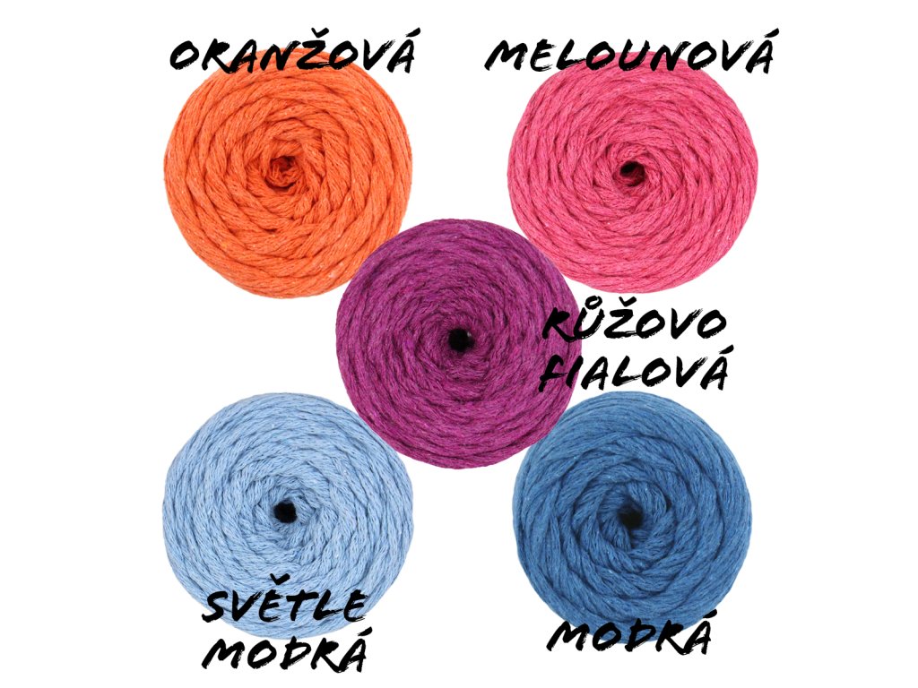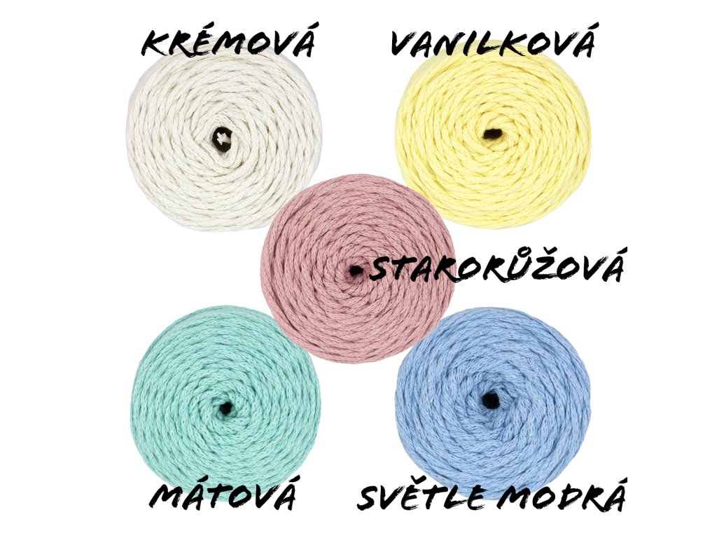 V balení je potřebná metráž příze Cordy macrame 2,5mm (odstín dle zvolené varianty sady). Sada obsahuje také jutový provázek, přízi Mouline, tupou jehlu a sekaný drát - již potřebnou délku na vajíčko.
