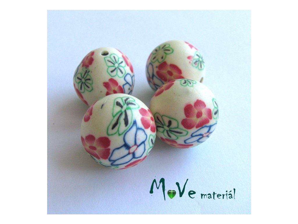 Fimo korálky 14mm, 4 kusy, krémové s květy