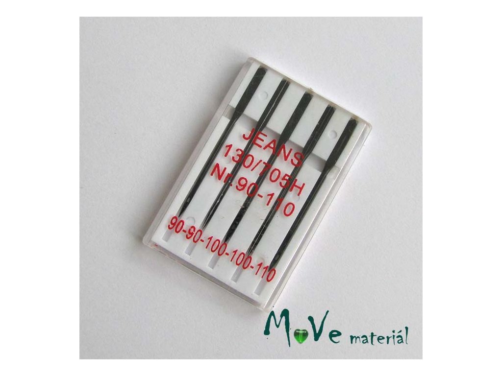 Jehly strojové jeans, velikost 90 - 110, vhodné na šití jeansových materiálů podle velikosti jehly, v balení 5 ks jehel různých velikostí.