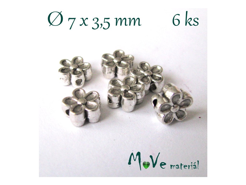 Kovový korálek kytička, průměr 7mm, tloušťka 3,5mm, průvlek 1mm, balení 6ks Neobsahuje alovo ani kadmium