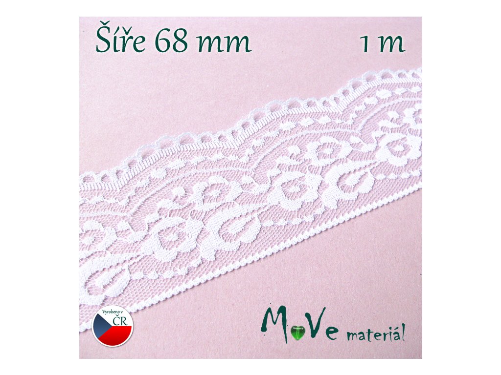 Bílá syntetická krajka šíře 68mm, balení 1m. Pokud objednáte více než 1m, bude zboží dodáno vcelku. Český výrobek.