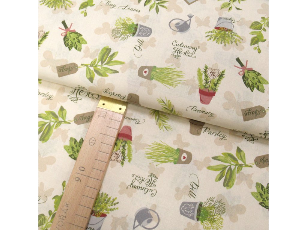 Bavlněné plátno - Bylinky na světle béžové - šíře 140cm/1bm